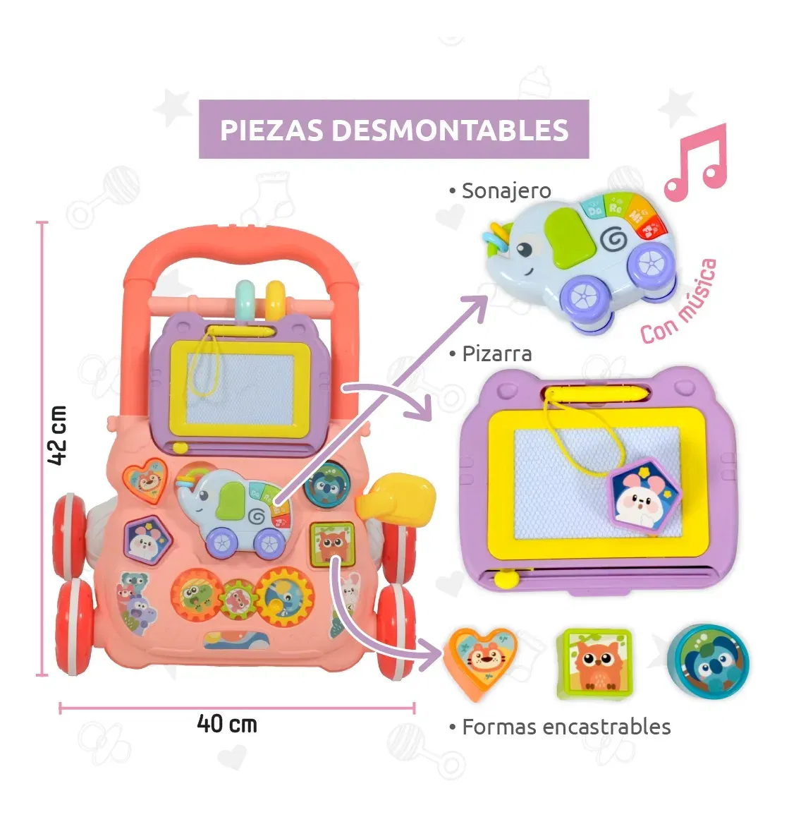 Accesorios incluidos: Pizarra Mágica, Sonajeros, bandeja interactiva, elefante extraible